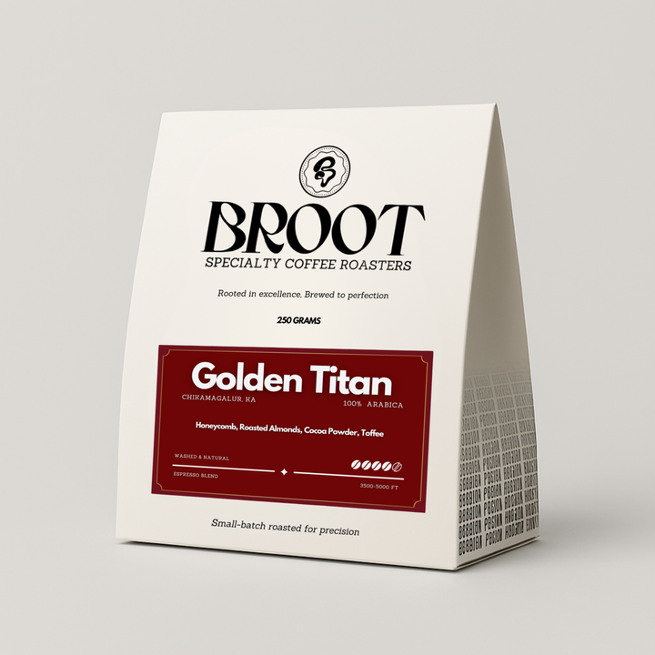 Crafted for those who enjoy richness without the bitterness, Golden Titan is a luxurious espresso blend bringing out the natural sweetness of Indian Arabica beans. With bold notes of honeycomb and roasted almonds, balanced by cocoa powder and a buttery toffee finish, this blend offers a smooth, velvety shot with just the right crema. Designed for espresso lovers seeking complexity and comfort in every sip.