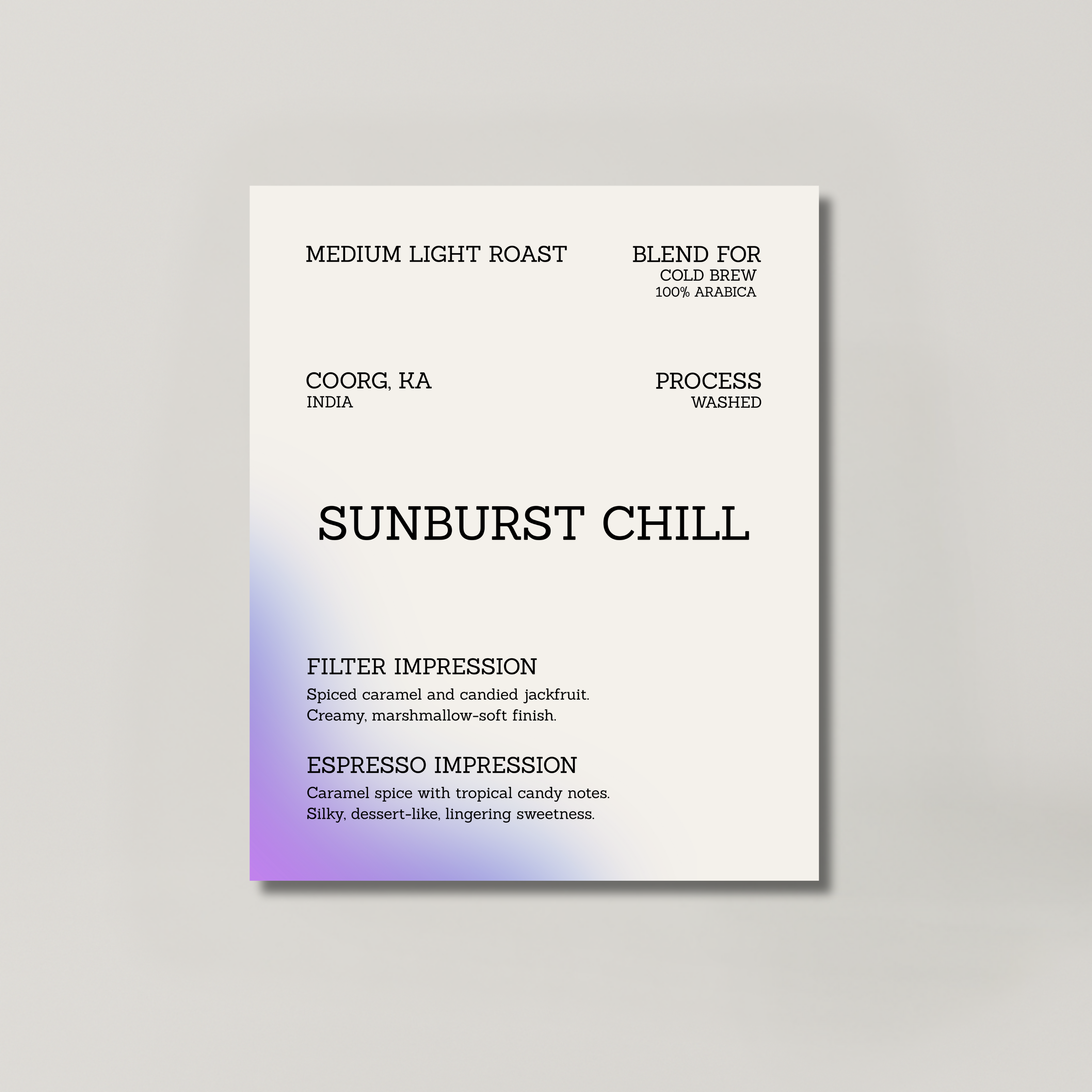 Sunburst Chill is summer bottled into coffee. Crafted as a bright and lively cold brew blend, it bursts with vibrant citrus from blood orange, soft florals from jasmine tea, and a mellow sweetness of pear kissed with honey. Smooth, refreshing, and easy to sip — this one’s made for sunny days and cool moods.